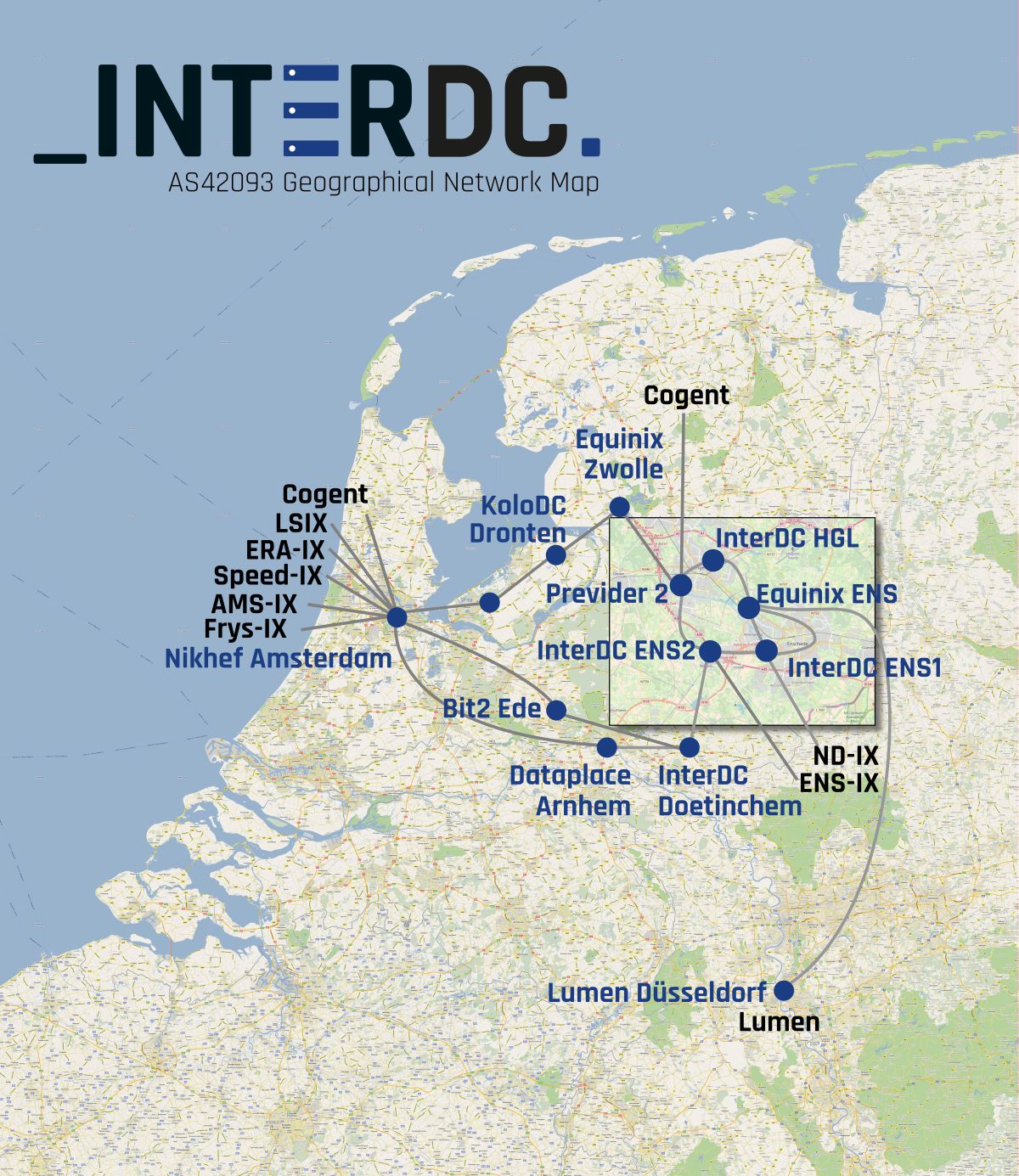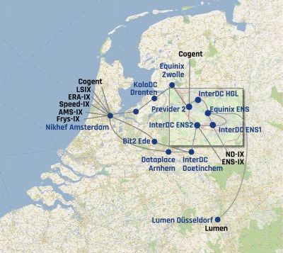 InterDC heeft per locatie minimaal 2 geografisch gescheiden fibers liggen (minimaal 5 meter uit elkaar, volgens de Tier norm). We hebben aansluitingen naar Equinix Enschede, Previder PDC2 (Hengelo), Dataplace Arnhem, Nikhef Amsterdam en Düsseldorf Duitsland. Vanaf deze locaties kunnen we connecties naar alle aangesloten datacenters leveren.